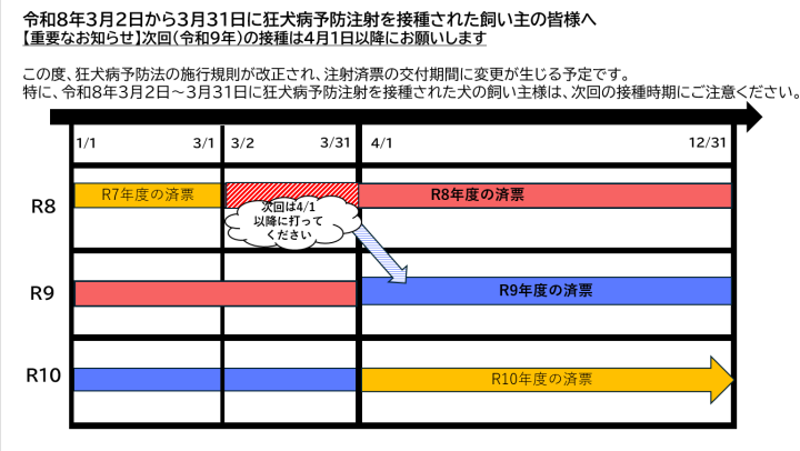 令和8年3月2日から31日までに狂犬病予防注射を接種した犬に対しては、国からの通知により「令和8年度」の注射済票を交付します。(令和8年4月1日から令和9年3月31日までに接種した場合も「令和8年度」の済票を交付)なお、令和8年3月2日から3月31日までの期間に狂犬病予防注射を接種した場合は、国からの依頼により次回(令和9年度)の注射を令和9年4月1日以降にお願いいたします。